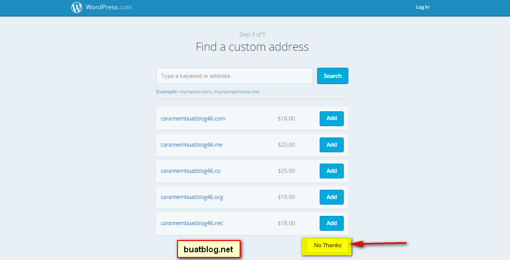 Klik Next Step untuk melanjutkan. Pada tahap ini Anda akan di beri referensi atau pilihat alamat blog berbayar dengan menghilangkan subdomain wordpress.com menjadi alamatbloganda.com. Jika Anda tidak tertarik dan tetap memilih blog gratis, klik pada No, Thanks untuk melewatinya. Lihat gambar;