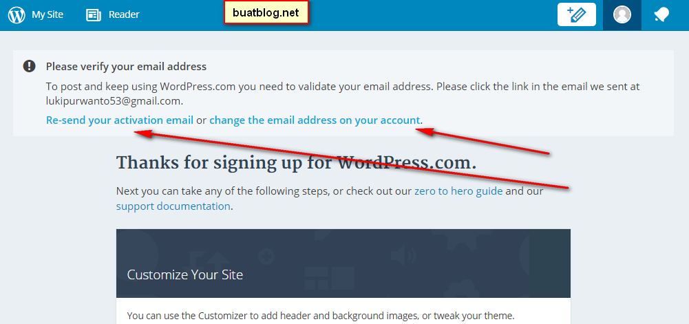Pada tahap ini Anda sudah selesai dalam membuat blog di wordpress, sekarang saatnya memverifikasi akun Anda. Masuk ke email Anda, pastikan wordpress sudah mengirimi email aktivasi akun Anda. Jika belum kirim ulang email Anda dengan cara klik Re-send your activation email atau ganti alamat email Anda dengan cara klik pada change the email address your account. Lihat gambar;
